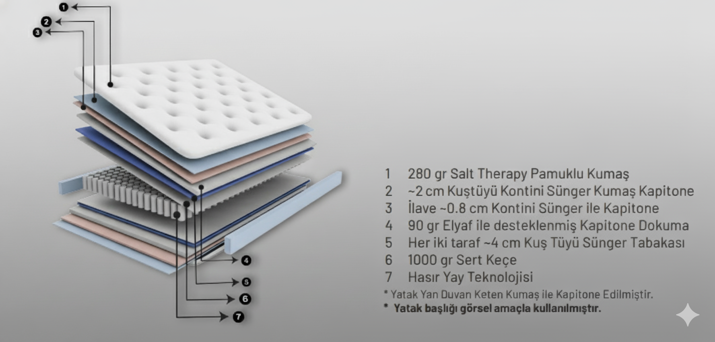 Yatağın her iki yönünde kullanılan 4 cm Kuş Tüyü Süngerleri ve kapitone yapısında ayrıca yer alan 2 cm Kuş Tüyü Süngeri sayesinde vücudun yatak üzerine ilk tensel temasının sağlandığı andan itibaren, yumuşak ve ipeksi yapısıyla sizi karşılamaktadır. Bu yapısal özellik sayesinde tenin vücut ağırlığı altında ezilmesinin önüne geçilmiştir. Bu sayede uygulanan basınç en az indirgenerek uyku sırasında istemsiz meydana gelen dönme hareketleri en aza indirgenmiştir.