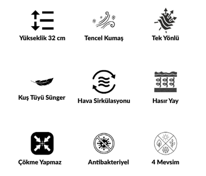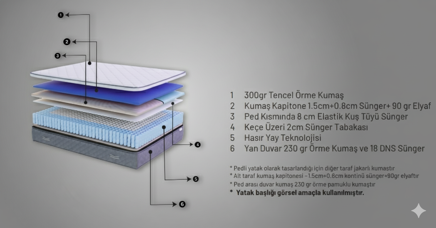 Ped içeriğinde kullanılan 8 cm Kuş Tüyü Soft Süngeri ile yatağa uygulanan baskıyı emer ve dağıtır. Bu dağılım siz uyurken kan basıncından dolaşım sorununa kadar birçok problemin azalmasına yardımcı olur. Yatak yüzeyinde kullanılan Tencel kumaşı ise bitkisel kaynaklardan elde edilen doğal bir kumaş türüdür. Hipoalerjenik özellikleri ile dikkat çeken Tencel kumaş türü, bu sayede üst düzey konfor sağlamasının yanı sıra sürdürülebilirlik arayanlar için idealdir.