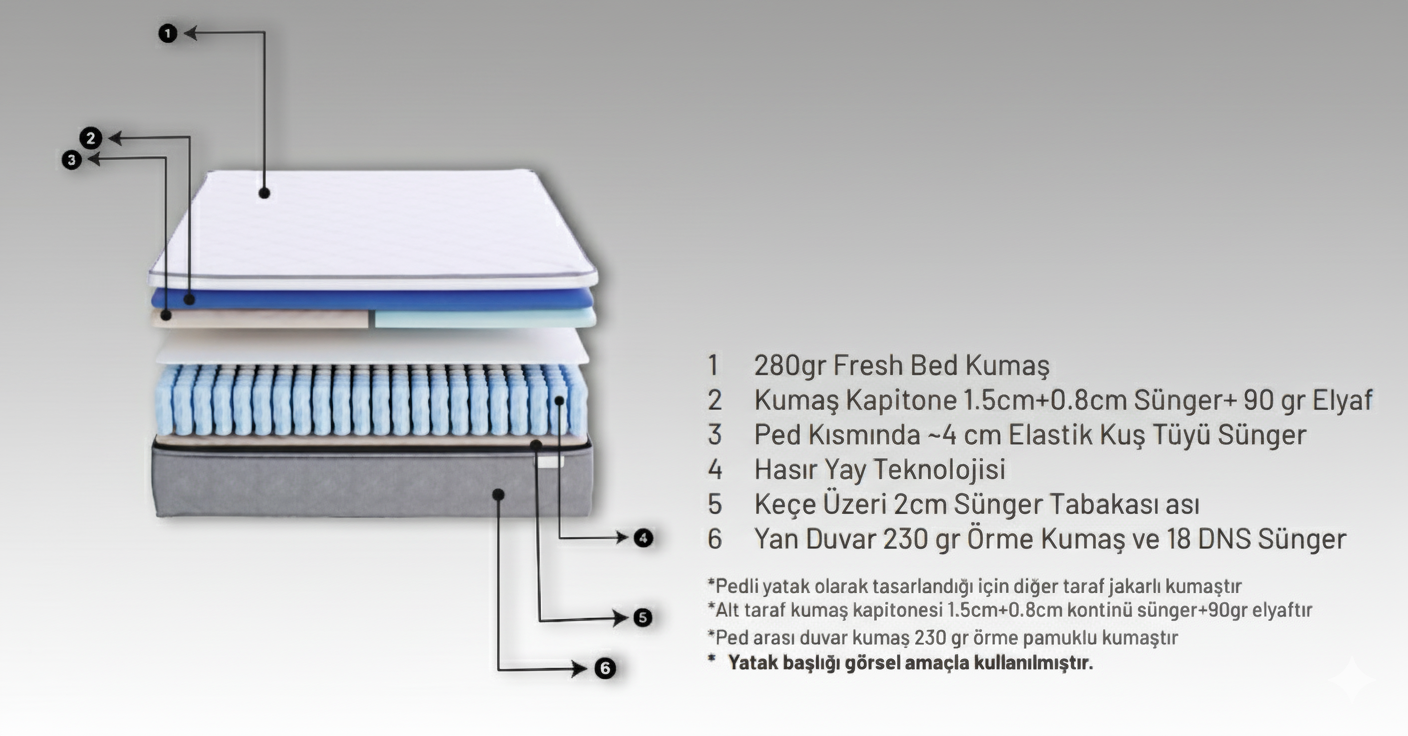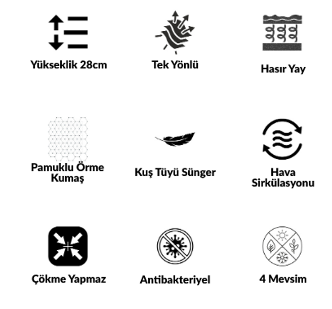 Yatak yüzeyinde yer alan 280 gr Pamuklu örme kumaşın verdiği zarafet ile ped içerisinde yer alan kuş tüyü süngerin verdiği konfor tek bir yatakta birleşti. Özel tasarlanmış sabit pedi sayesinde uyku esnasında ki istemsiz dönüşler minimuma indirilerek uyku bölünmelerinin ortadan kalkması amaçlanmıştır. Tek taraflı olarak tasarlanan bu yatak 4 mevsim kullanım imkanı ile öne çıkmaktadır.